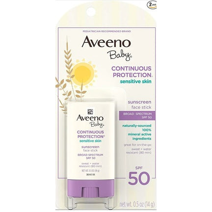 0.5-ounce stick of Aveeno Baby Continuous Protection Sensitive Skin Sunscreen Stick with SPF 50 in a convenient, TSA-friendly travel size for superior broad spectrum protection from harmful UVA and UVB rays for your little one's skin