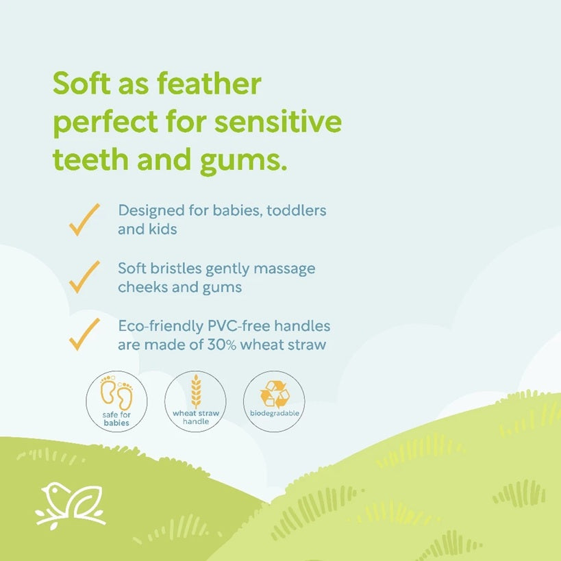 Designed for babies toddlers and kids with sensitive teeth and gums. Ultra-fine, super-dense, soft bristles gently massage cheeks and gums. Over 10,000 micro-fiber bristles that deeply clean teeth and covers more surface area. Soft as feather, perfect for sensitive teeth, bleeding gums and toothaches. Food-grade silicone tongue cleaner at the back of the brush gently removes bacteria and debris on tongue. Handle made with biodegradable wheat straw. Comes with a toothbrush cover.