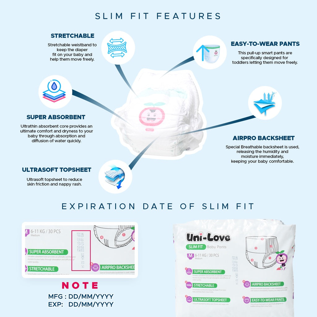 Uni-Love Slim Fit Baby Pants is newly-improved smart pants made with special breathable backsheet to keep your baby more comfortable. Its stretchable waistband will surely keep the diaper fit on your baby, letting them move freely without unnecessary leakages.
