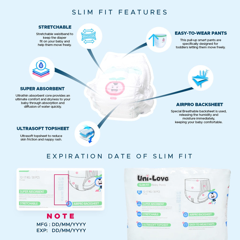 Uni-Love Slim Fit Baby Pants is newly-improved smart pants made with special breathable backsheet to keep your baby more comfortable. Its stretchable waistband will surely keep the diaper fit on your baby, letting them move freely without unnecessary leakages.