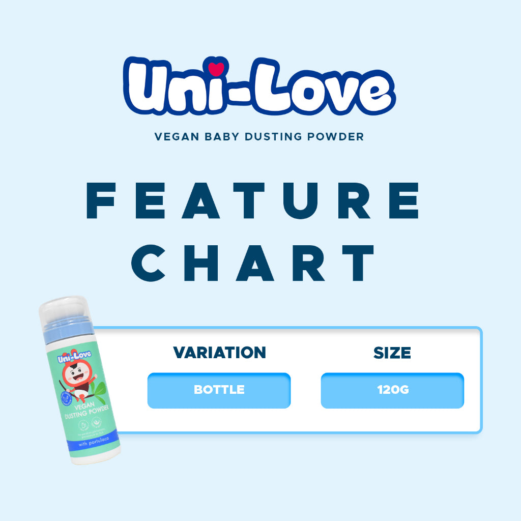 Uni-Love Vegan Baby Dusting Powder with Portulaca soothes and pampers sensitive skin with its plant-based ingredients. It has no paraben, phthalates, petrolatum, and SLS keeping your baby's sensitive skin safe, soft and comfortable.
