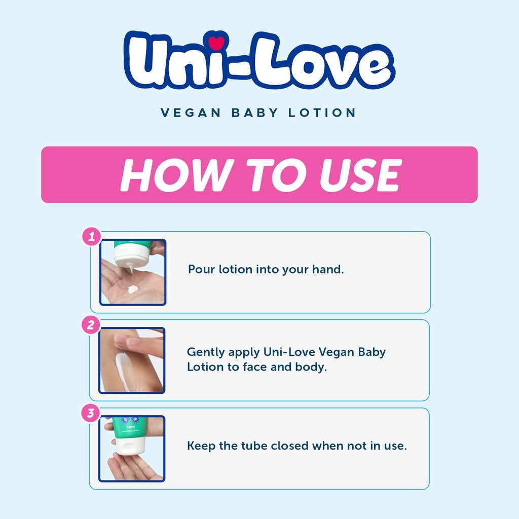 Uni-Love Vegan Baby Lotion is perfectly light for moisturising baby's face & body. It has plant-based squalane ingredient. It is paraben-free and dye-free, especially designed for baby's sensitive skin.